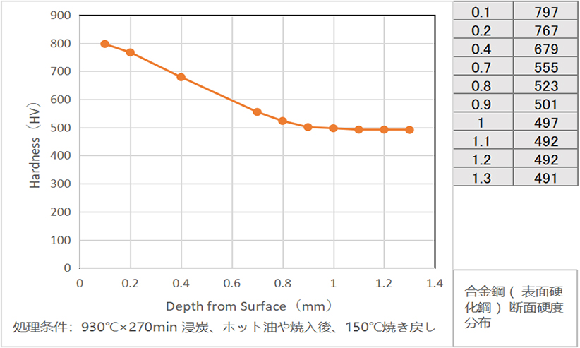 表層付近は800HVと高い硬さを確保し、全硬化層深さは約0.9mm得られています。